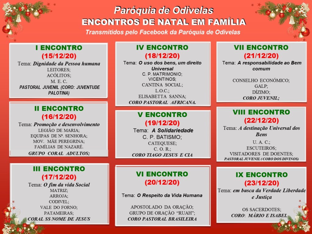 Divulgamos a escala dos “Encontros de Natal em família”, uma novena de encontros que começam a 15 de Dezembro e terminam a 23 de Dezembro, todos os dias pelas 21 horas.