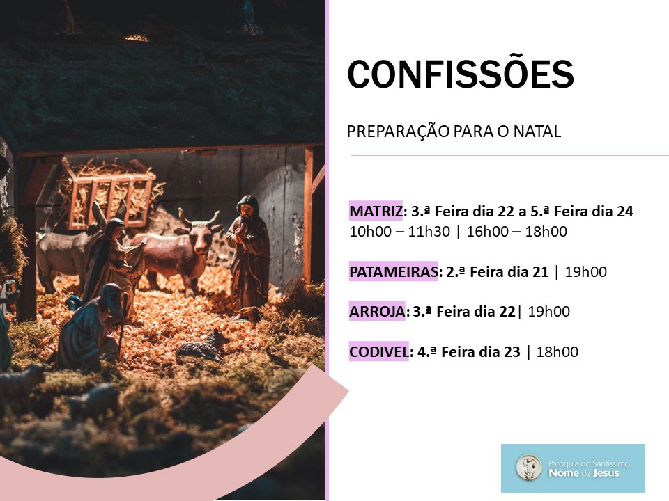 Divulgamos os horários para o Sacramento da Reconciliação antes do Natal para toda a Paróquia: ao contrário do que tem vindo a ser hábito nos últimos anos, não haverá uma celebração penitencial única na Igreja Matriz com a presença de sacerdotes da Vigararia, para minimizarmos os ajuntamentos devido à pandemia.