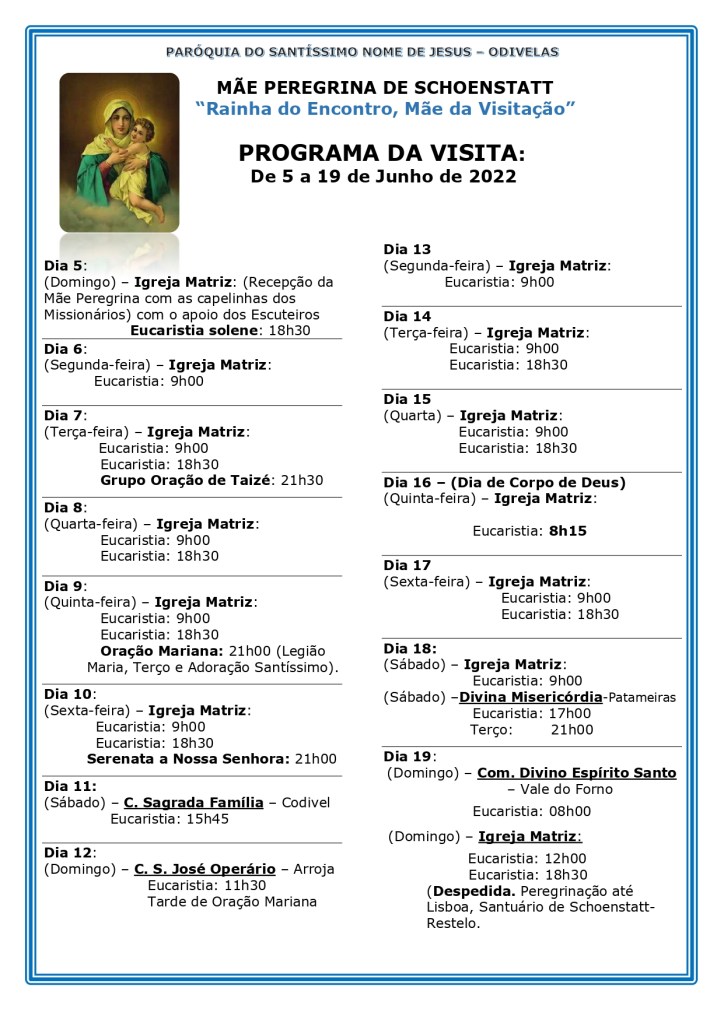 Divulgamos o programa da visita à nossa Paróquia da Mãe Peregrina de Schoenstatt, que estará connosco – na Matriz e nos Núcleos – de 5 a 19 de junho.