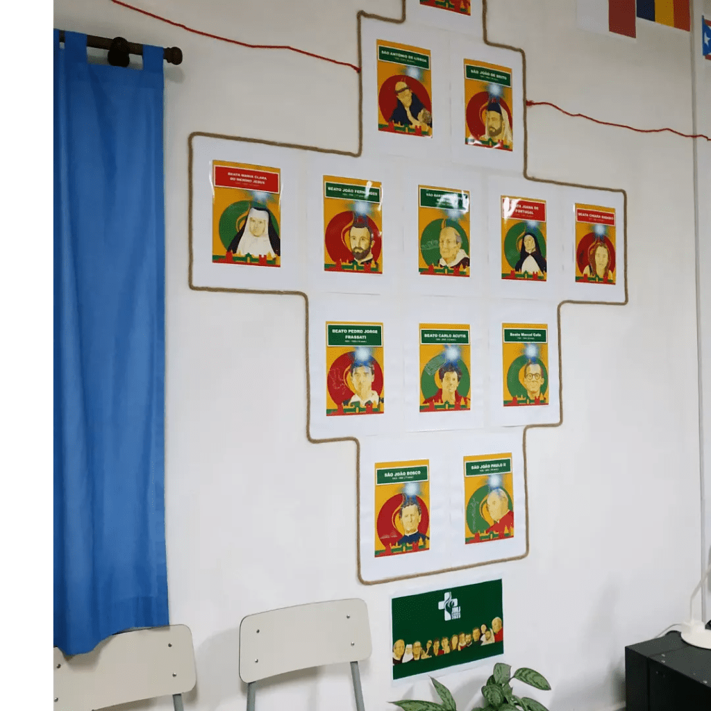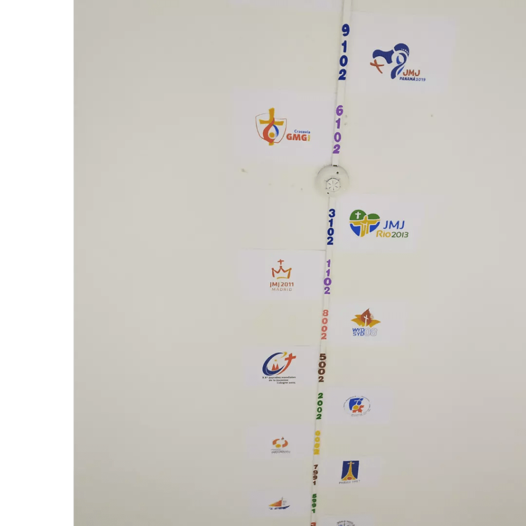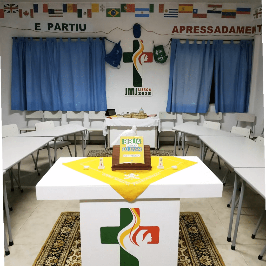 Mostramos aqui alguns detalhes desta sala das Patameiras, transformada praticamente na íntegra pelo padre Juliano, para acolher todos/as: não só quem está a trabalhar de forma mais próxima para este evento na nossa Paróquia, mas também todos os que se queiram envolver nesta caminhada até à Jornada Mundial da Juventude – ou estejam apenas curiosos! 🧐
