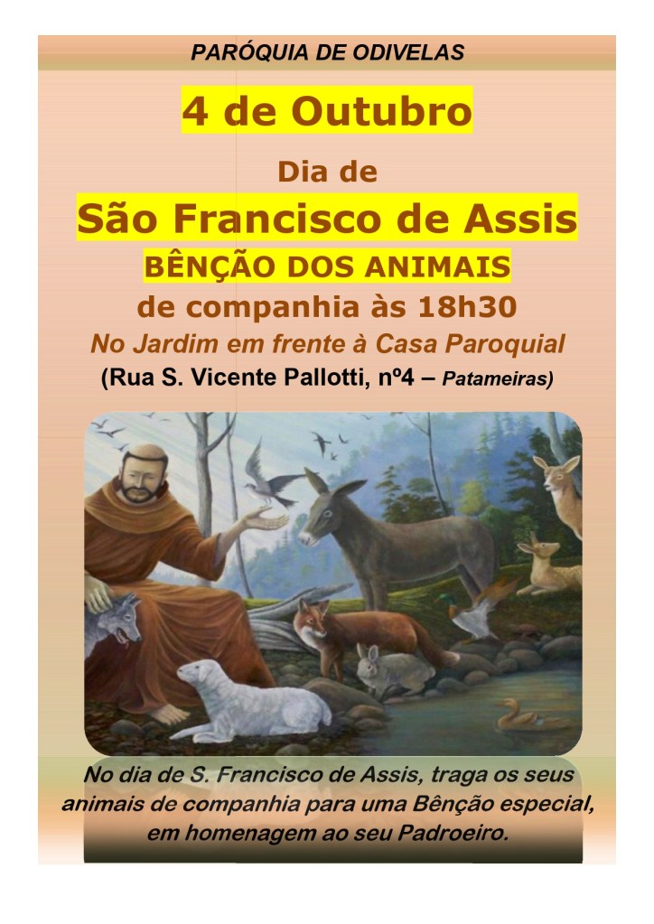 4 de Outubro – 18h30 – Bênção dos animais no Dia de S. Francisco de Assis No jardim em frente à Casa Paroquial, na Rua de São Vicente Pallotti (Igreja das Patameiras)